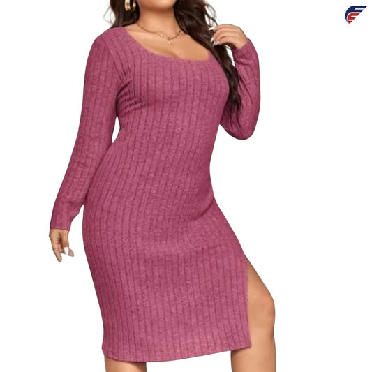 Gray and Rose Red Long Sleeve Knitted Dress with Side Slit and U-Neck Collar